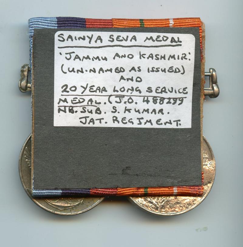 ( Unnamed ); 20 Years Long Service Medal ( J.O. 488299 N.B.Sub S Kumar, Jat Regt