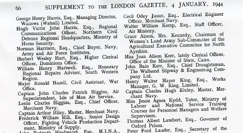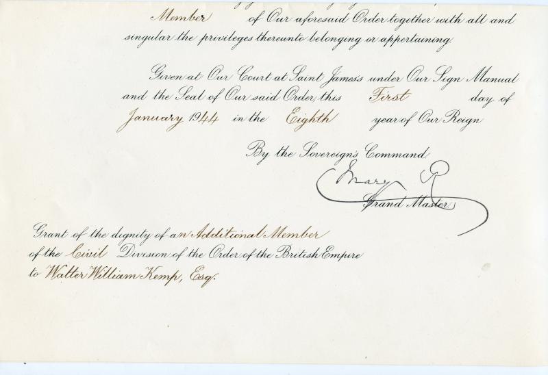 The Most Excellent Order of the British Empire, MBE (Civil) ; Awarded to Walter William Kemp , Staff Officer, Air Ministry. of Harrogate