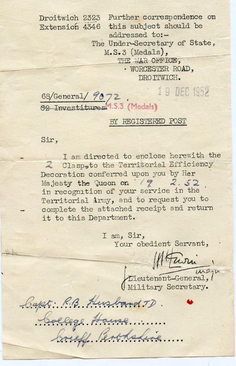 also with letter from The War Office Dated 19th December 1952 addressed to Captain R B Husband of College House Crieff Perthshire