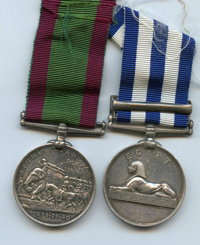 Second Afghan War Medal , 1877-80 no Clasp: (2158 Hosp Sgt T Folley, 1/18th Regt); Egypt Medal 1882 : 1 Clasp The Nile 1884-85 (2158 Sergt T Folley, 1 Rl Irish Regt)