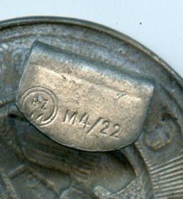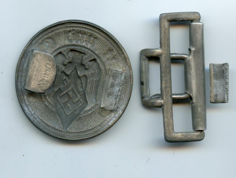 circular belt buckle worn by Hitler Youth leaders on both the brocade and the leather service belt. Marked ‘RZM M4/22 Fastener snapped from buckle but part still there