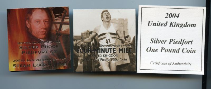 UK 2004 Silver Proof Piedfort Coin Set 3 Coin Set £2 Trevithick Coin, £1 Forth Road Bridge, Roger Bannister 50 Pence Coin In Royal Mint box of Issue with certificates