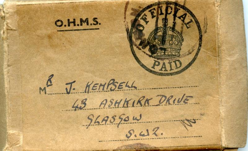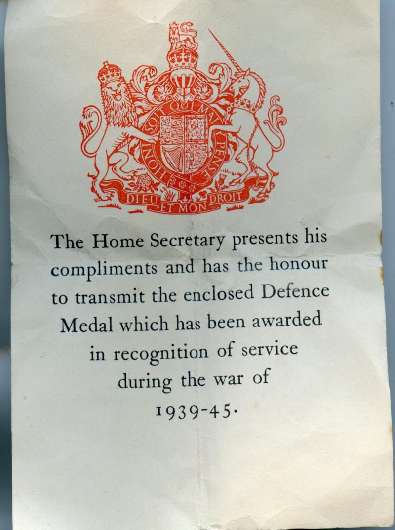 WW2 Boxed Defence Medal 1939-45 with Home Secretary compliments Slip addressed to MR J Kempsell, 43 Ashkirk Drive, Glasgow S.W.2.