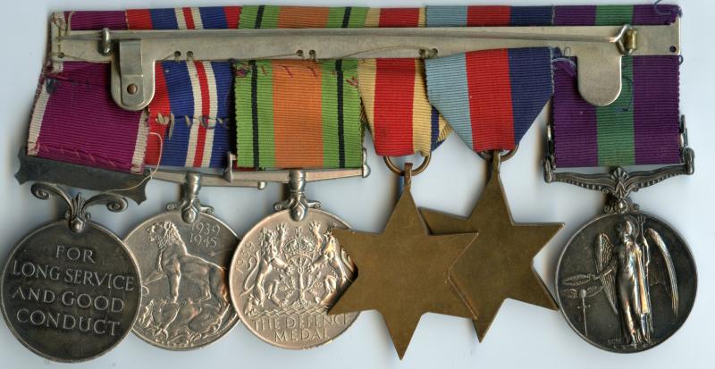 General Service Medal 1918-62 : 1 Clasp : Palestine ( 1073635 Sgt G. H. Wheatley, R.H.A.); 1939-45 Star; Africa Star with clasp 8th Army; Defence and War Medals 1939-45; Army Long Service Medal : George VI ( 1073635 Sgt G. H. Wheatley, R.A.); Meritorious Service Medal : QE2 ( 1073635 Sgt G. H. Wheatley, R.E.M.E.)