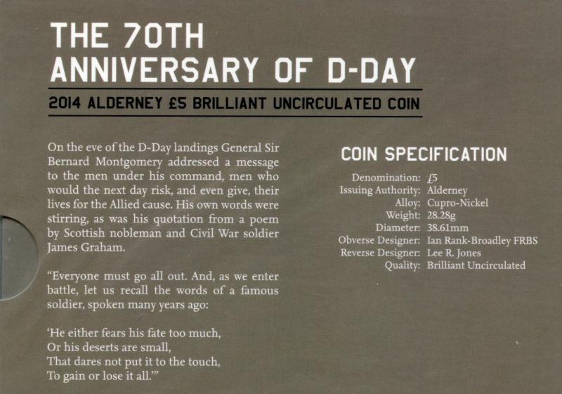 Alderney 2014 70th Anniversary of D-Day Brilliant Uncirculated £5 Coin In Royal Mint Packet of Issue