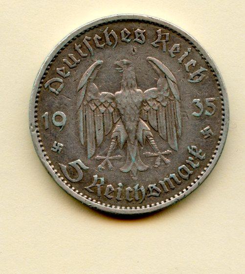 Germany 5 Marks Reverse: Potsdam Garrison Church Dated 1935a Condition VF Ref KM 83 Silver Fineness: 0.9000 Weight: 13.88g ASW: 0.4016oz