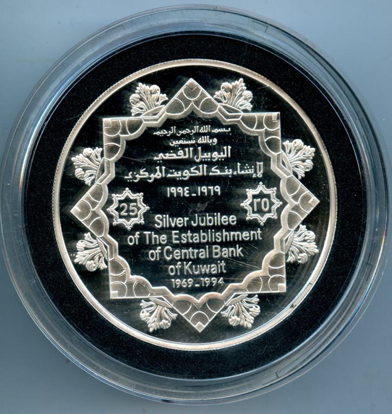 Kuwait Central Bank 25th Anniversary Silver 5 Dinars Dated 1994 72.5 Grams .925 Silver