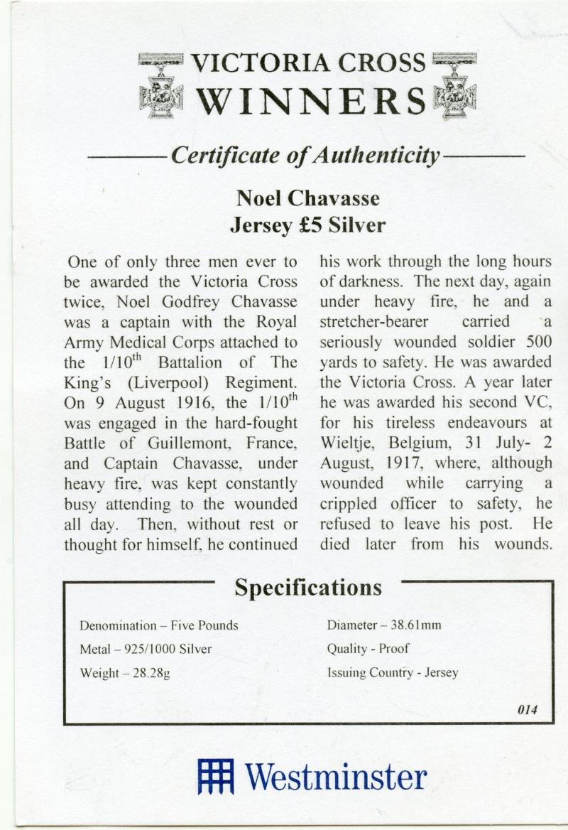 2006 Jersey Silver Proof £5 Coin Victoria Cross Winners - Noel Chavasse, Royal Army Medical Corps Guillemont 1916 With Certificate of Authenticity.