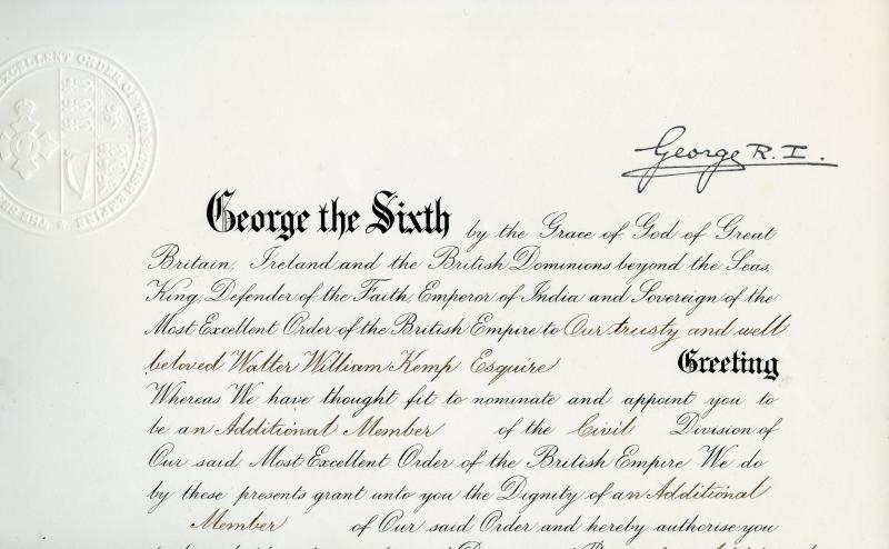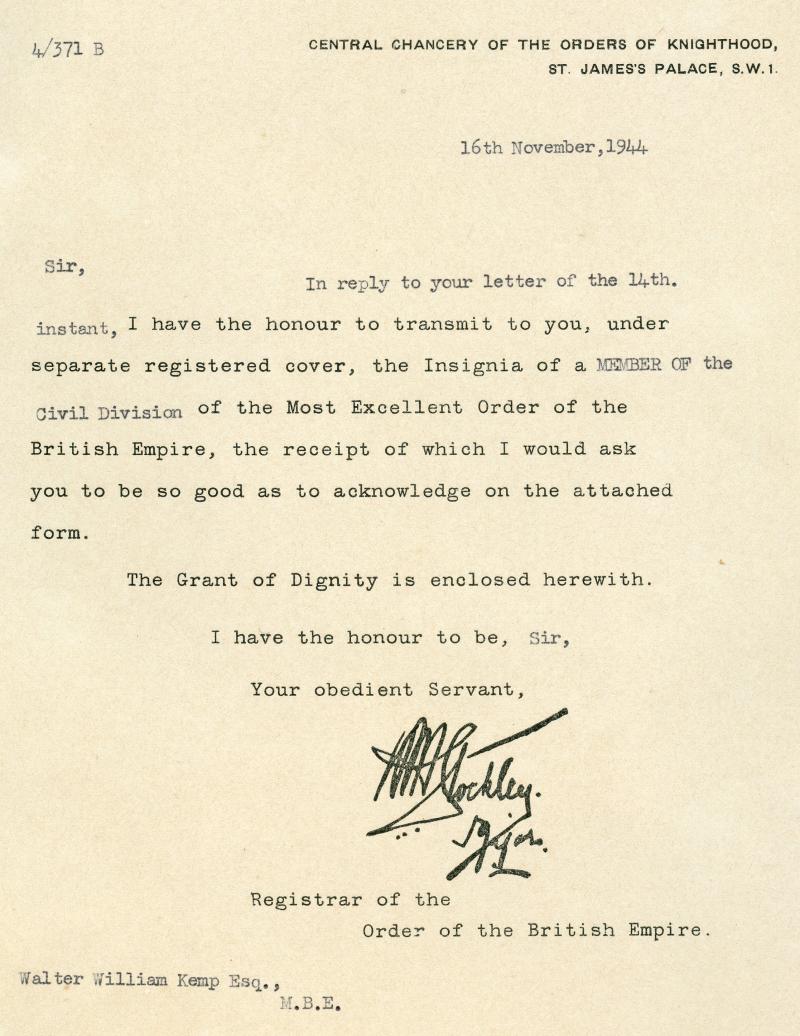 The Most Excellent Order of the British Empire, MBE (Civil) ; Awarded to Walter William Kemp , Staff Officer, Air Ministry. of Harrogate