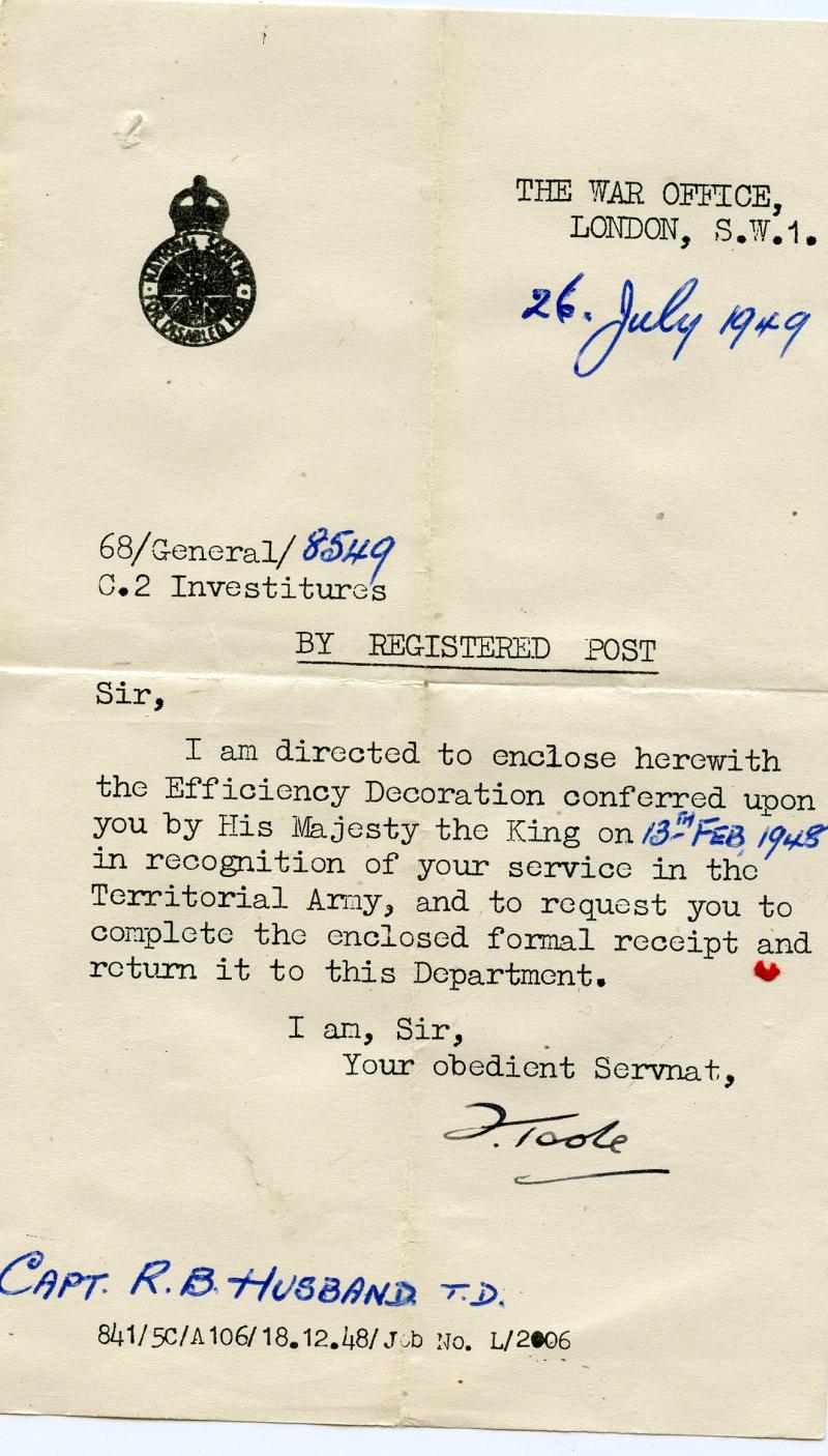 In Fitted box of Issue with War Office Investitures Letter dated 26th July 1949 addressed to Capt R B Husband