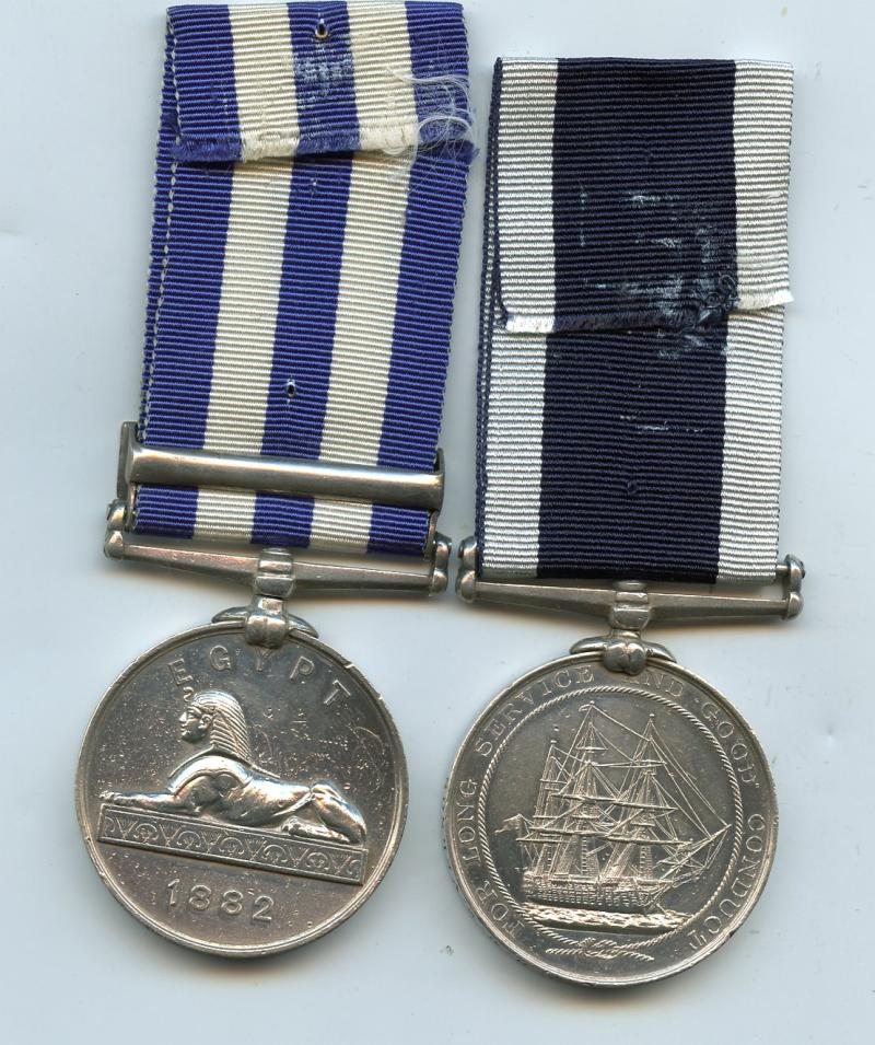 Egypt Medal 1882 : 1 Clasp : Alexandria 11th July ( G Wells, Stkr HMS Inflexible); Navy Long Service and Good Conduct Medal : Victoria ( Geo Wells, Ldg Sto HMS Vernon)