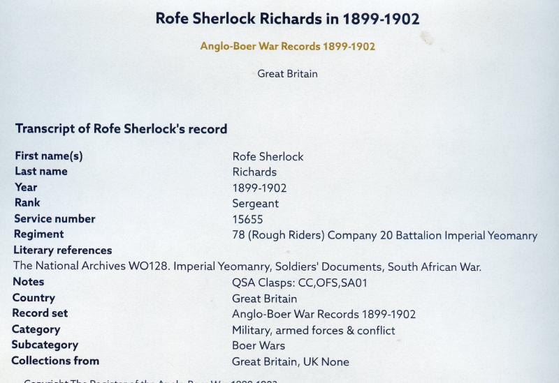 Queens South Africa Medal 1899-1902 3 Clasps To Sgt Rofe Sherlock Richards, 20th Battalion, Imperial Yeomanry, City of London Yeomanry (Rough Riders),