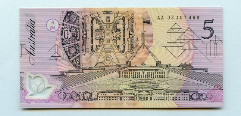 Australia Five $5 Dollars First Polymer Banknotes First Prefix AA Serial Number AA03467460 Signatures Fraser/Cole Condition Uncirculated References P 50, TBB 218