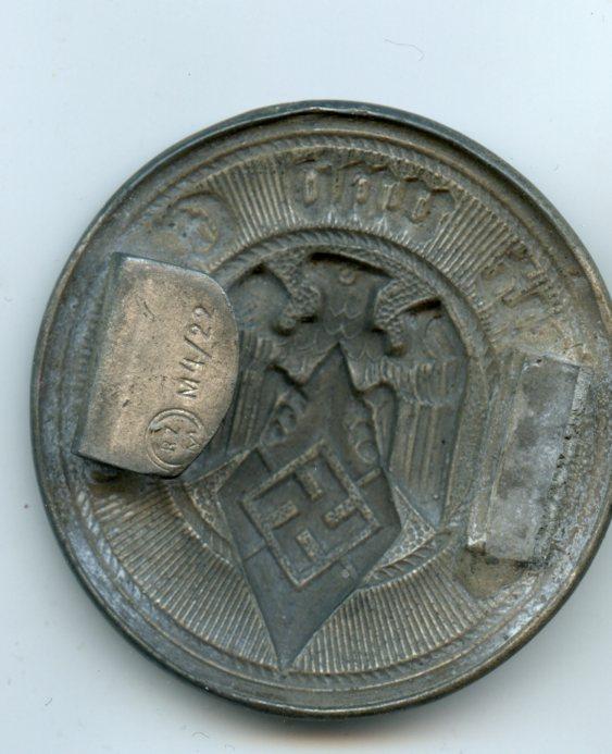 circular belt buckle worn by Hitler Youth leaders on both the brocade and the leather service belt. Marked ‘RZM M4/22 Fastener snapped from buckle but part still there