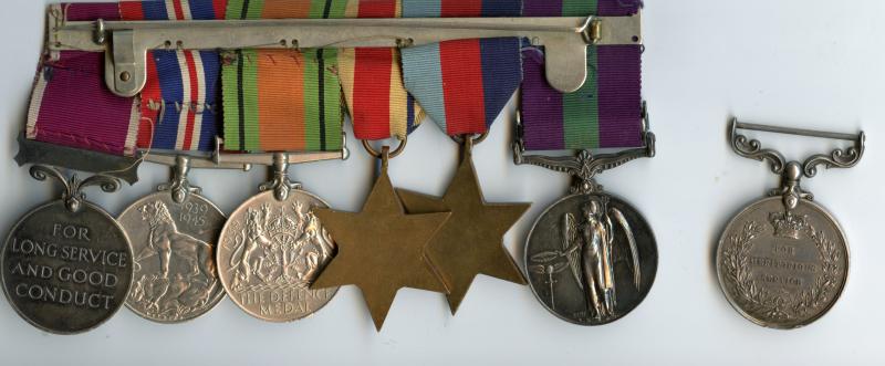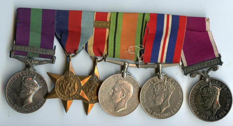 General Service Medal 1918-62 : 1 Clasp : Palestine ( 1073635 Sgt G. H. Wheatley, R.H.A.); 1939-45 Star; Africa Star with clasp 8th Army; Defence and War Medals 1939-45; Army Long Service Medal : George VI ( 1073635 Sgt G. H. Wheatley, R.A.); Meritorious Service Medal : QE2 ( 1073635 Sgt G. H. Wheatley, R.E.M.E.)
