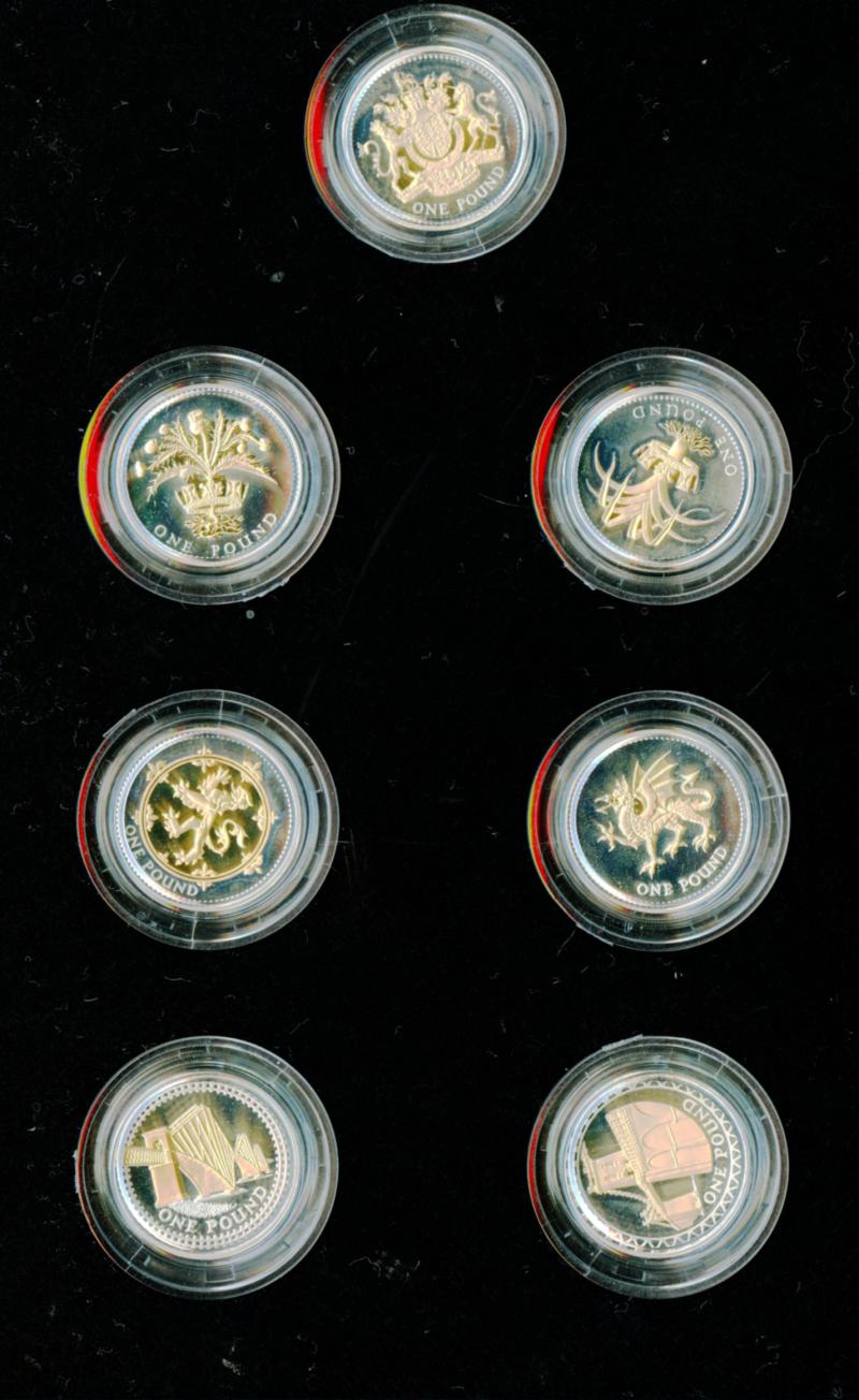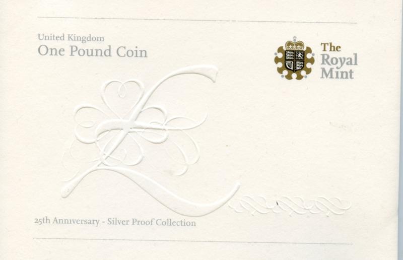2008 UK 25th Anniversary £1 Proof Silver 14-Coin Collection 2008 UK £1 - Silver Proof 25th Anniversary 14 Coin Set The collection comprises 14 silver proof £1 coins, each one featuring a different design, which is coated in 24 carat gold, used on the £1 coin over the last quarter of a century In Royal Mint Box of Issue with certificate