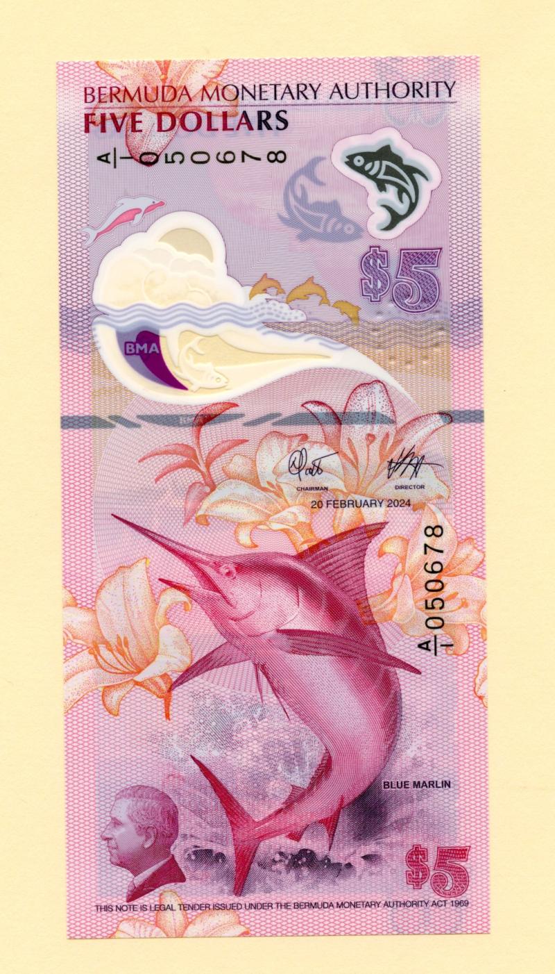 Bermuda Five 5 Dollars Banknote Dated 20 February 2024 Prefix A1 Uncirculated Condition Ref Pick 41 Note voted 2024 IBNS Bank Note Of Year