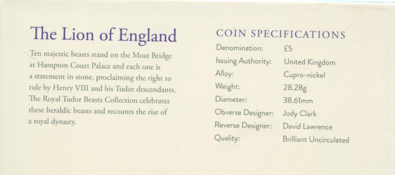 UK Royal Mint 2022 The Royal Tudor Beasts The Lion of England Brilliant Uncirculated £5 Coin In sealed Royal Mint pack of Issue