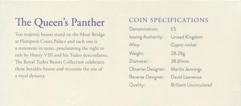 UK Royal Mint 2025 The Royal Tudor Beasts The Queen's Panther Brilliant Uncirculated £5 Coin In sealed Royal Mint pack of Issue
