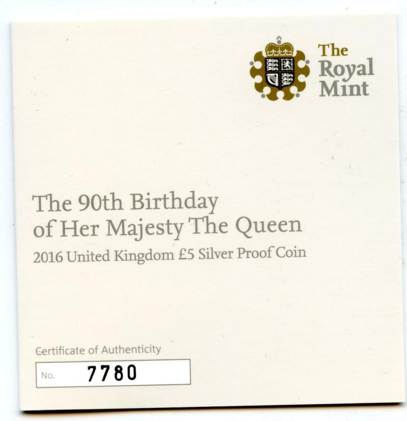 UK 2016 The Queen’s 90th Birthday Silver Proof £5 Five Pound Crown Coin In Royal Mint Case of Issue with certificate