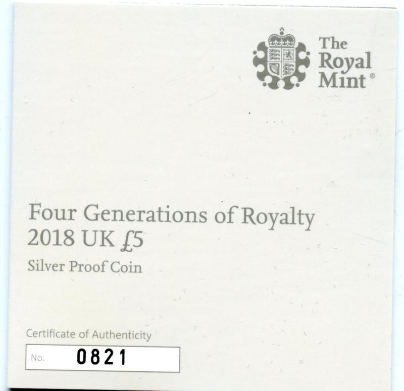 UK 2018 Four Generations of Royalty Silver Proof £5 Five Pound Crown Coin In Royal Mint Case of Issue with certificate