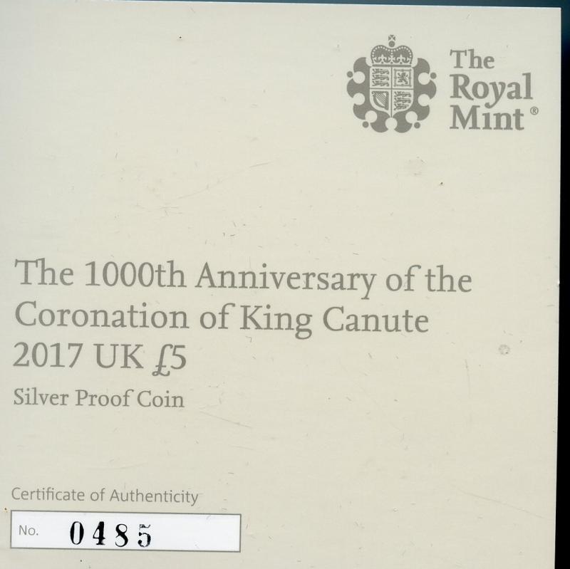 UK 2017 1000th Anniversary of King Canute Silver Proof £5 Five Pound Crown Coin In Royal Mint Case of Issue with certificate