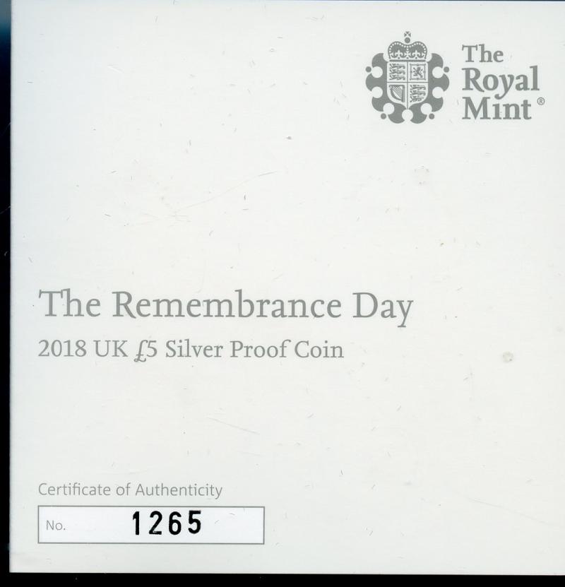 UK 2018 The Remembrance Day Silver Proof £5 Five Pound Crown Coin In Royal Mint Case of Issue with certificate
