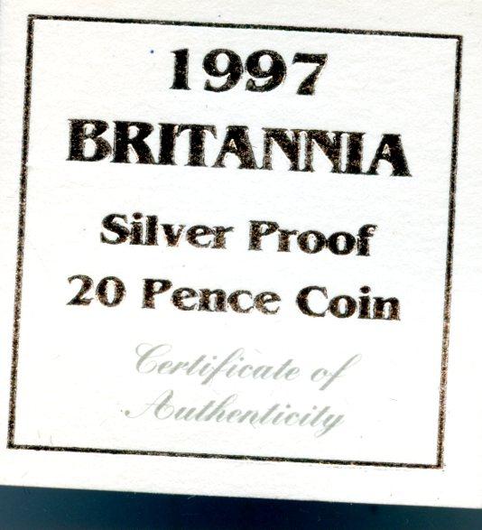 UK 1997 Silver Proof Britannia Tenth Ounce Silver Proof 20 Pence Coin With Royal Mint Box Of Issue and Certificate