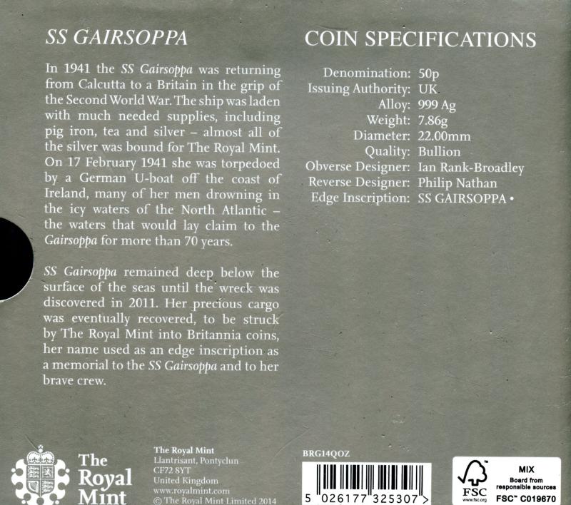 U.K.2014 Royal Mint Silver Proof Quarter Ounce SS Gairsoppa Britannia Coin In Royal Mint Pack of Issue with CD Silver Rush the story of SS Gairsoppa