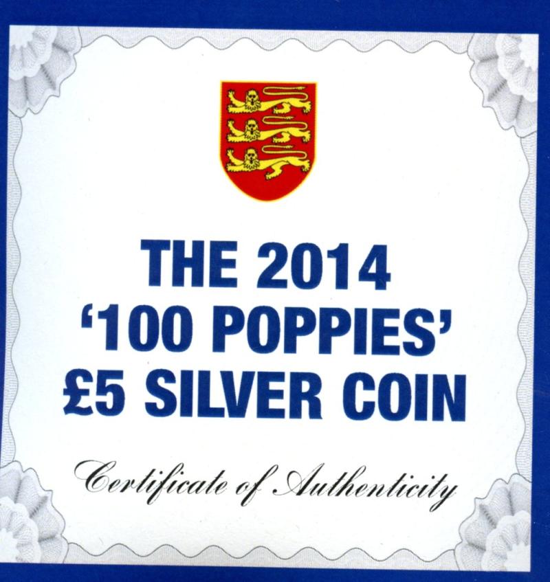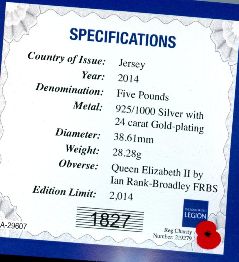 2014 Jersey 100 Poppies Silver Proof £5 Five Pound Crown Coin with 24 carat Gold Plating In Royal Mint Case of Issue with certificate