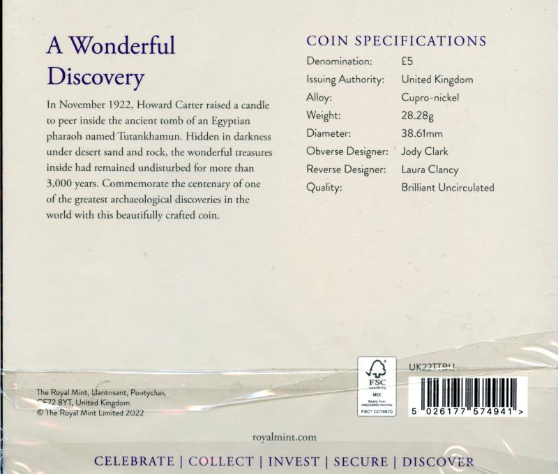 UK Royal Mint 2022 100th Anniversary of the Discovery of Tutankhamun's Tomb Brilliant Uncirculated £5 Coin In Royal Mint pack of Issue