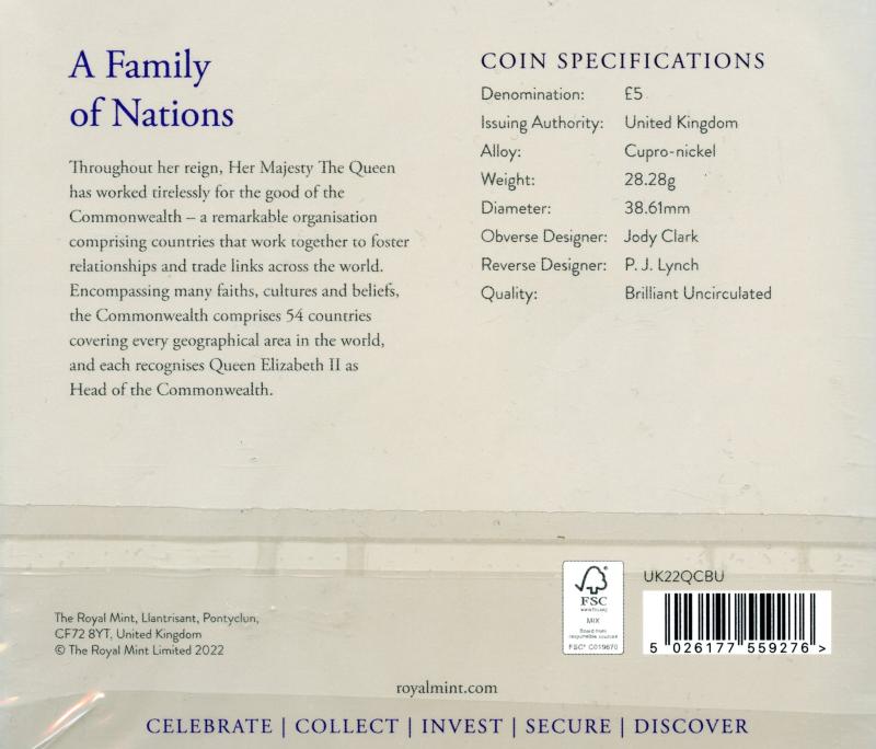 UK Royal Mint 2022 The Queen's Reign The Commonwealth Brilliant Uncirculated £5 Coin In Royal Mint pack of Issue