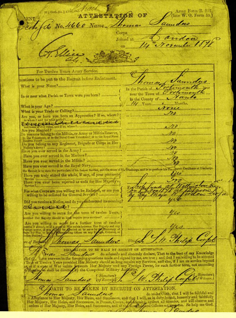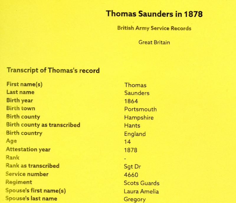 Sergeant Drummer Thomas Saunders born in Portsmouth in 1850 enlisted in the Scots Guards age just 14 height listed as 4 feet 4 inches